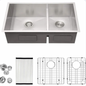 - ✅【Trustworthy Material 】Undermount double bowl kitchen sink is made from durable16-gauge T304 stainless steel with brushed finish that will not dull even after long-term use, designed with heavy-duty SOUND GUARD UNDERCOATING and THICK RUBBER PADDING to minimize noise and reduce condensation